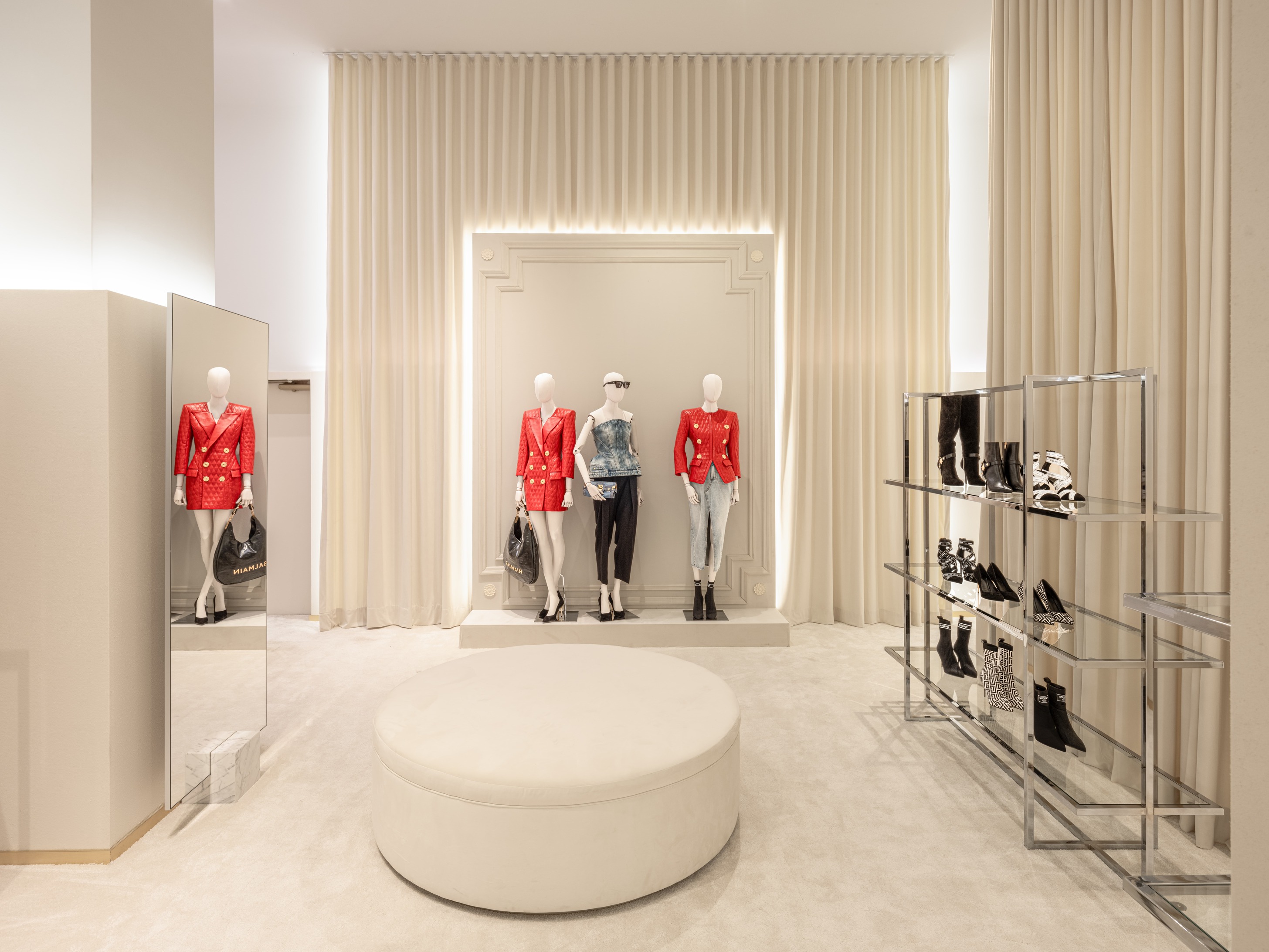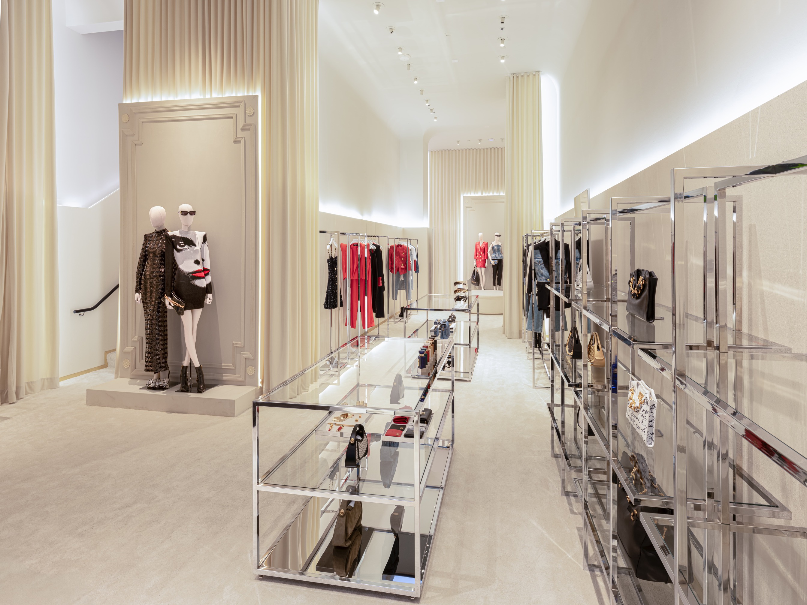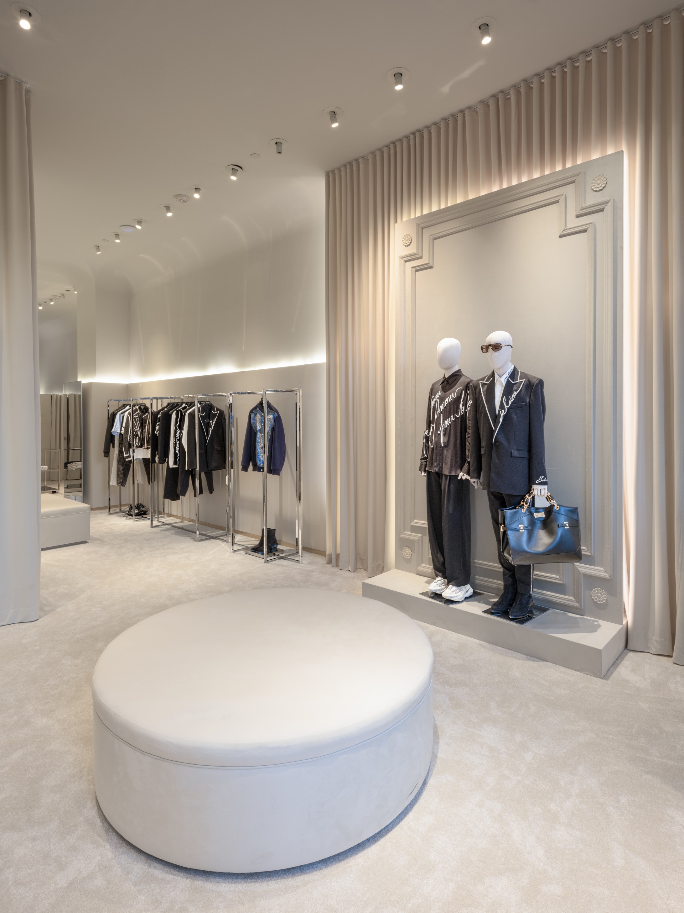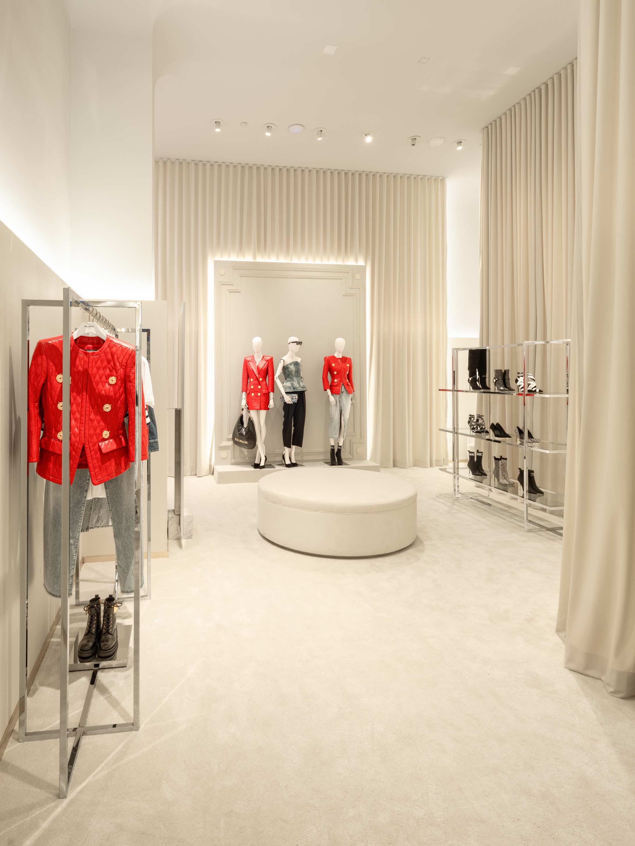 250 Meters of Wall to Wall carpet, 15 feet Velvet curtains in custom color, Vertical LED Lighting accenting curtain profiles throughout the store.