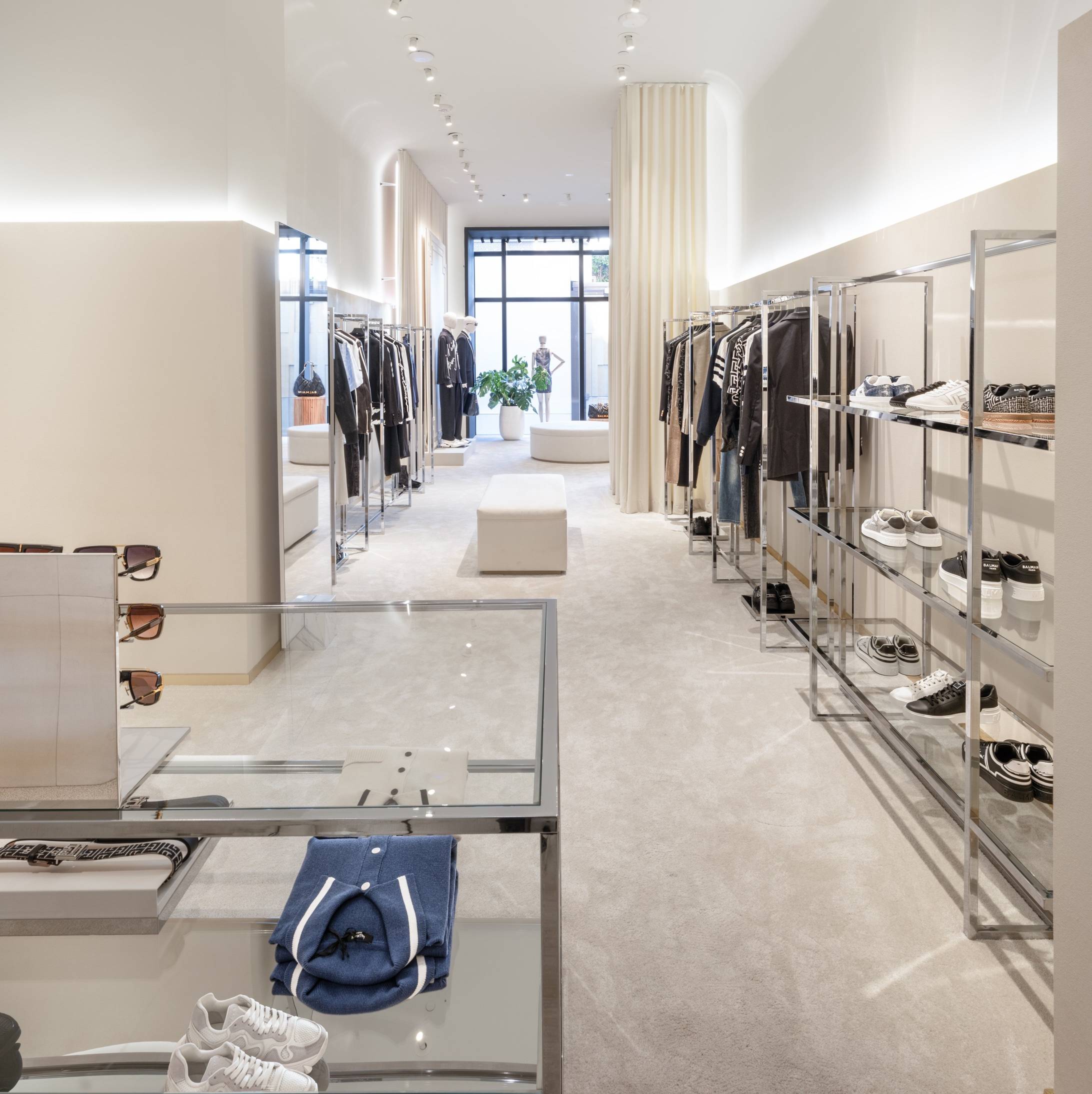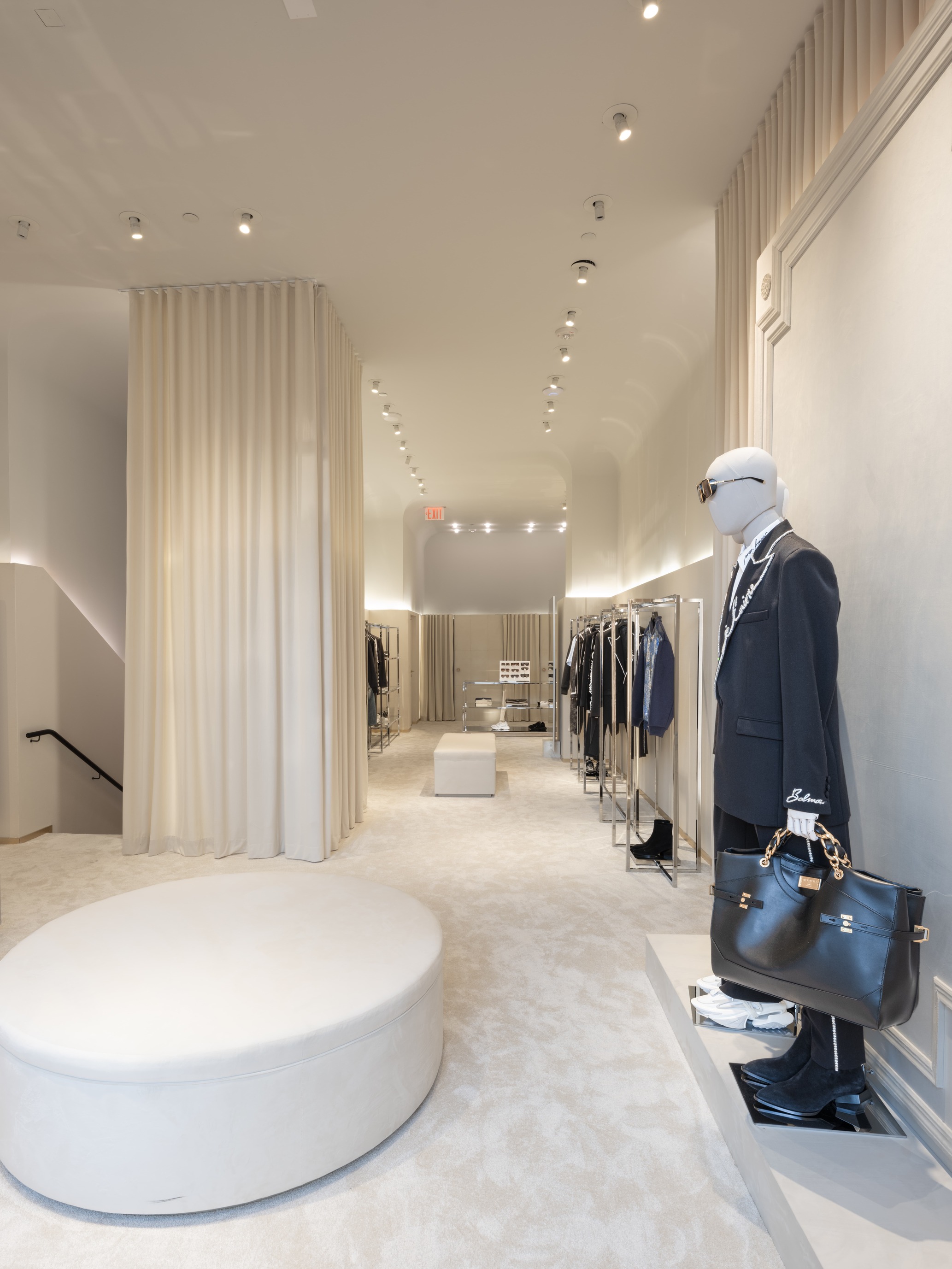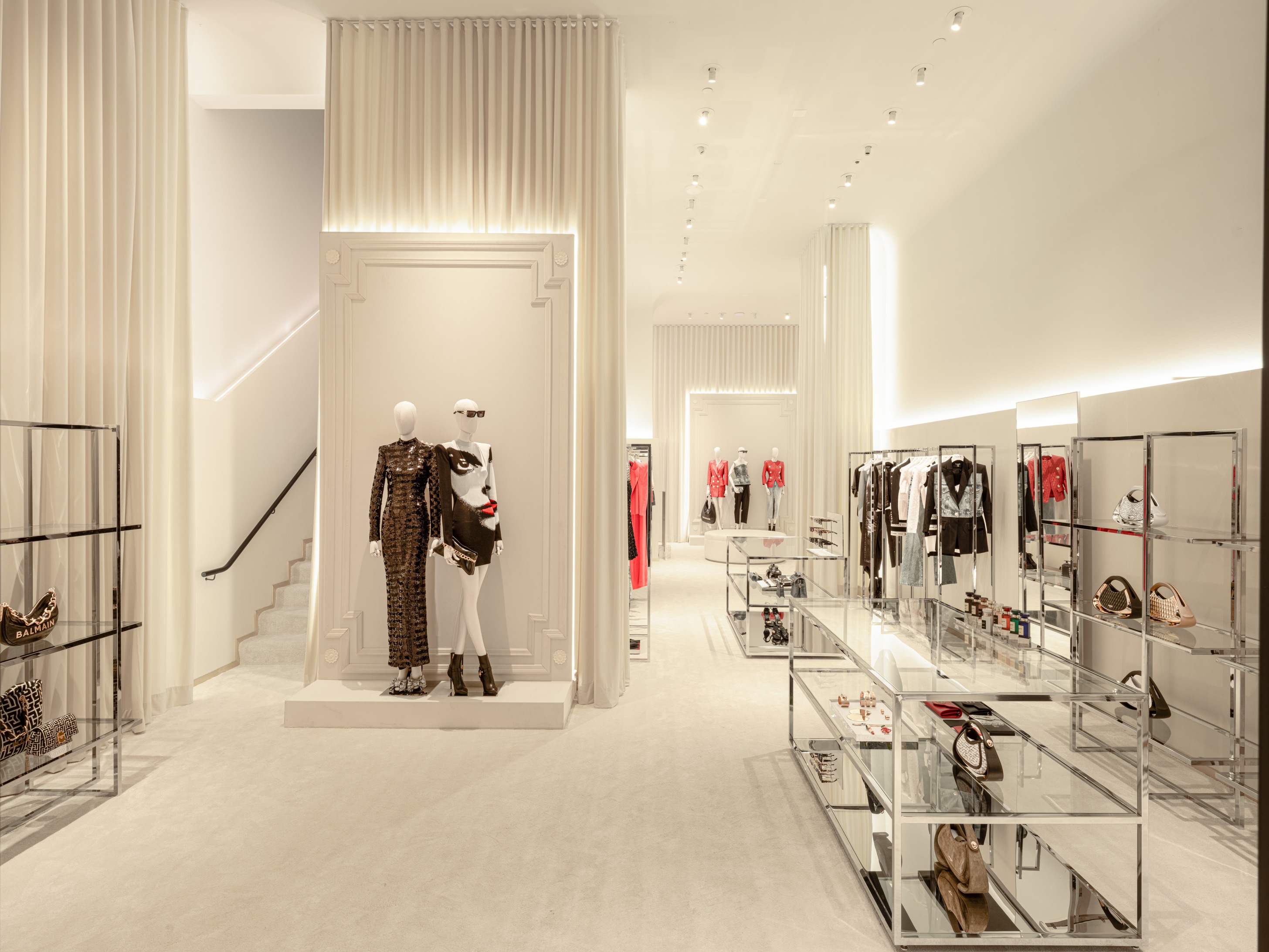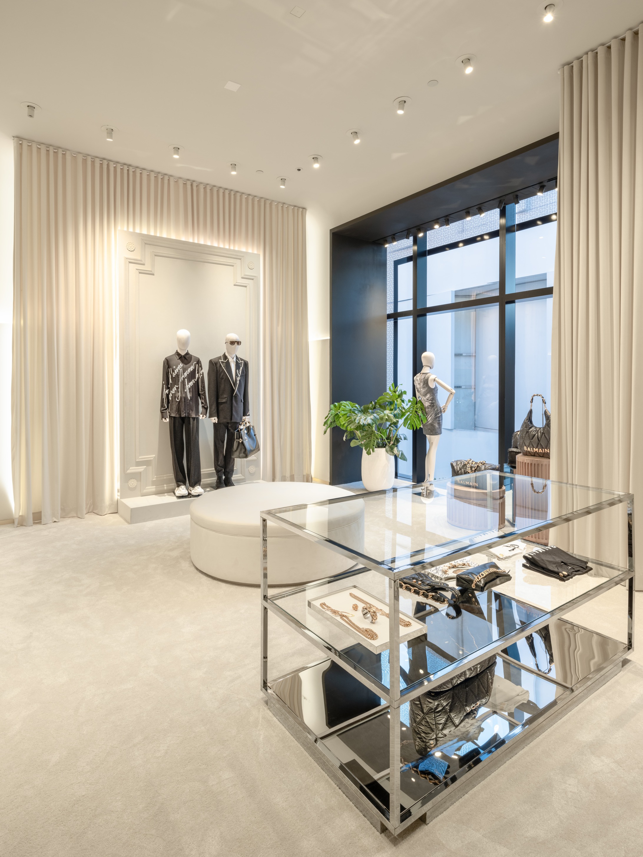 250 Meters of Wall to Wall carpet, 15 feet Velvet curtains in custom color, Vertical LED Lighting accenting curtain profiles throughout the store.